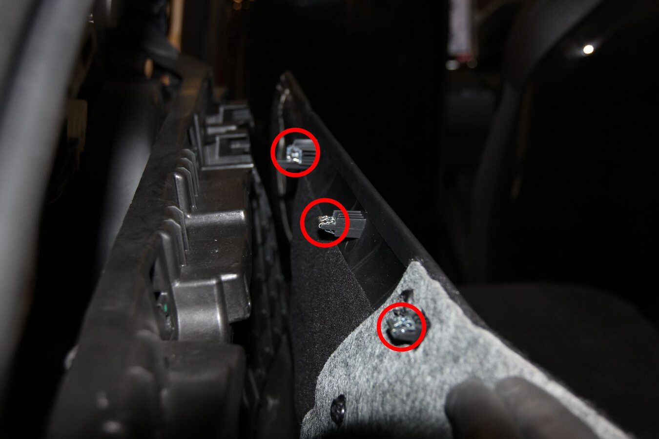 Note3x clips. Slide the panel down into position, and then connect the 12V outlet. Attach the clips at the top of the panel. Position the rear edge of the panel and feed the trunk tie down hook through, then fully seat the carpet surrounding the trunk nub.