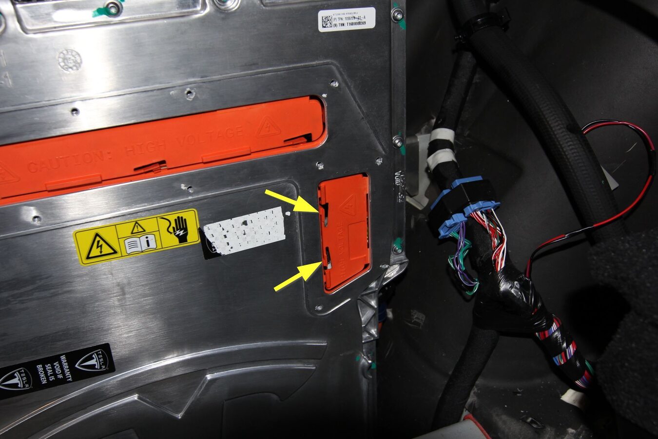- Release the black plastic tabs (x2), and then remove the rapid splitter cables from the charger HV outlet ports and set them aside.