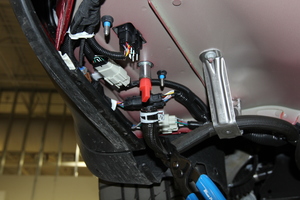 - Attach the PTC harness barrel clips (x2) to the D-pillar and charger bolt studs.