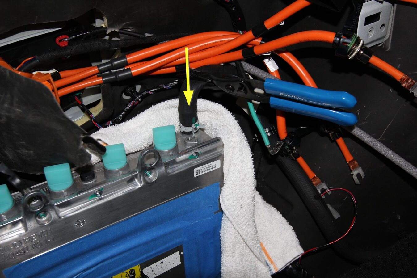 - Install coolant hose clamp pliers onto the coolant inlet hose.