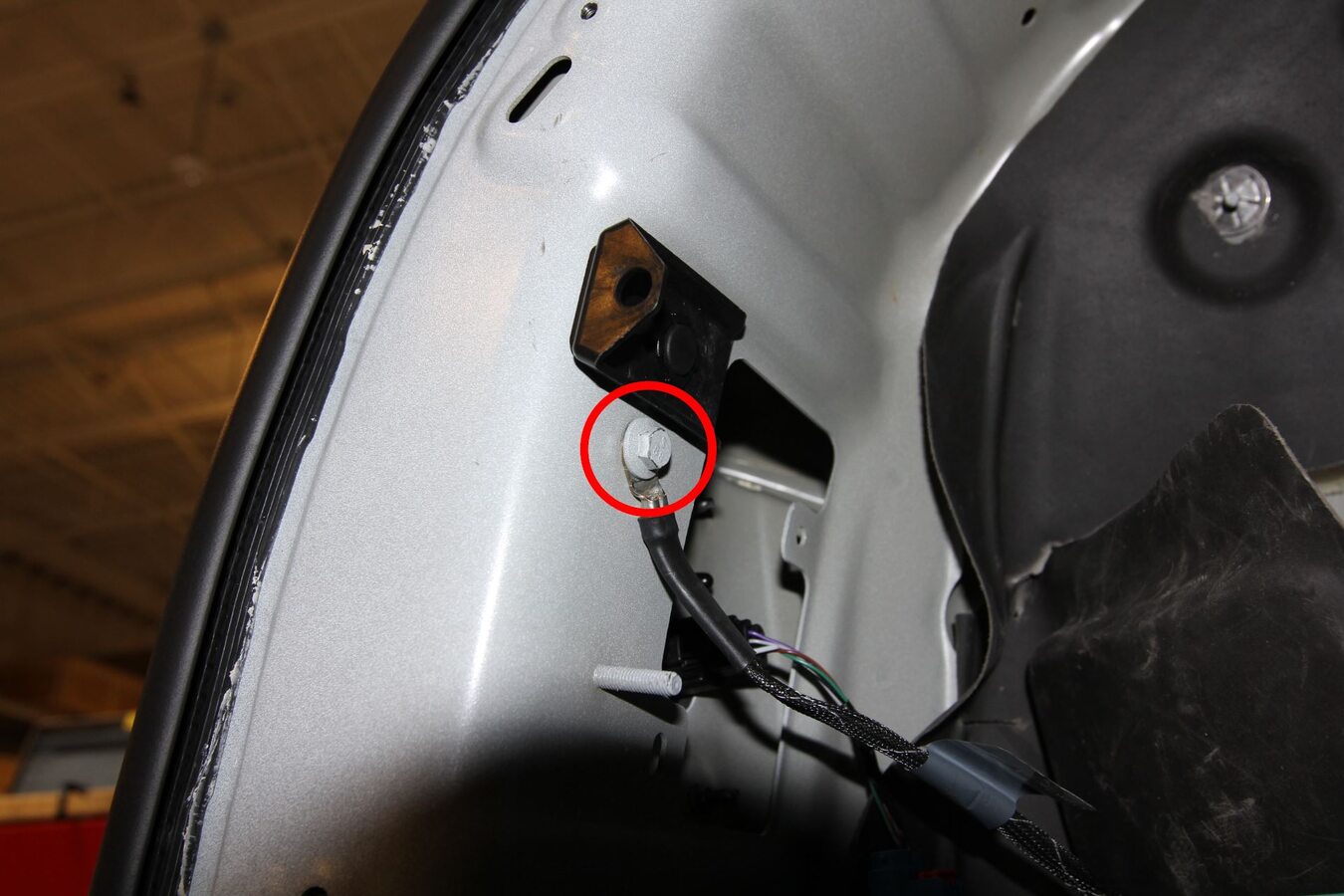 - Remove the bolt that attaches the ground strap to the D-pillar.