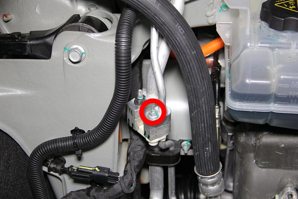 - Remove the nut that secures the condenser-to-chiller high pressure pipe to the charge port high pressure pipe (torque 10 Nm).