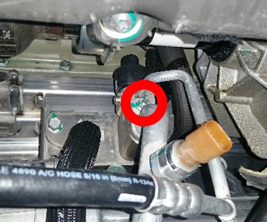 - Remove the nut that secures the condenser-to-chiller low pressure pipe to the charge port low pressure pipe (torque 20 Nm).