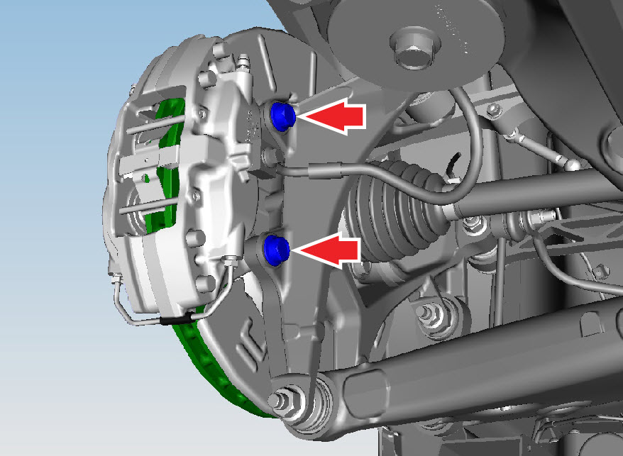 - Remove the bolts (x2) that secure the caliper to the knuckle (torque 120 Nm).