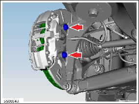 - Remove the bolts (x2) that secure the brake caliper to the knuckle (torque 120 Nm).