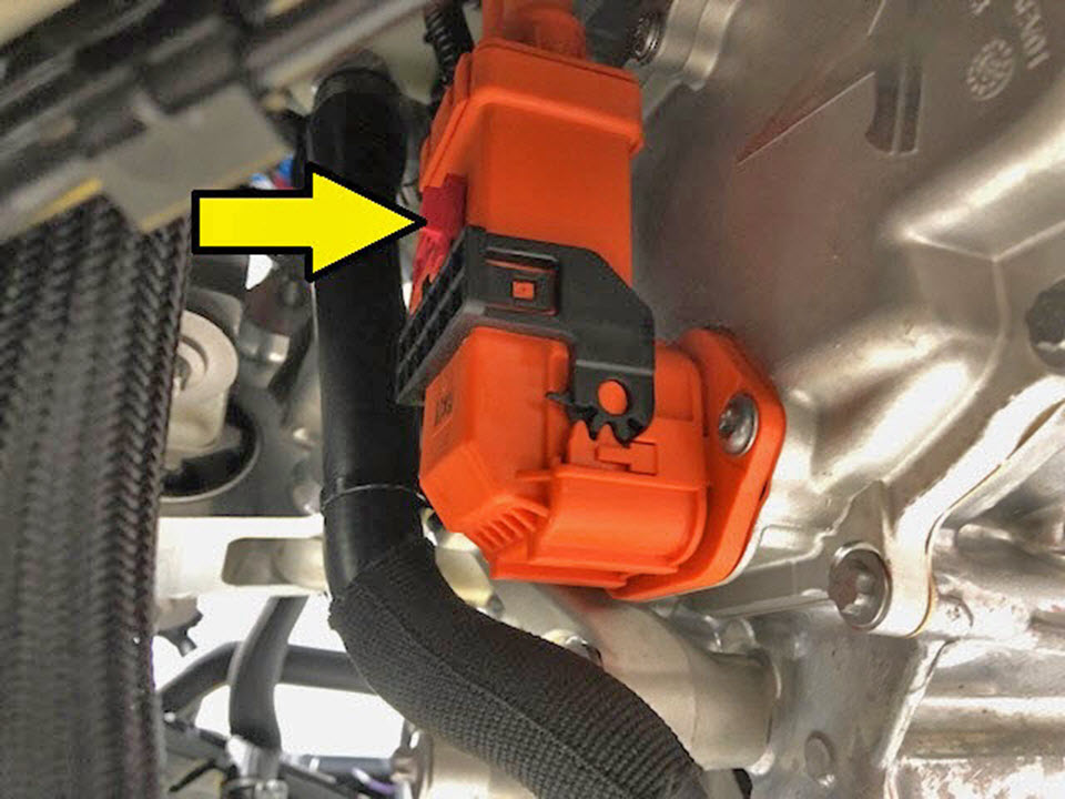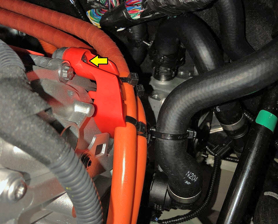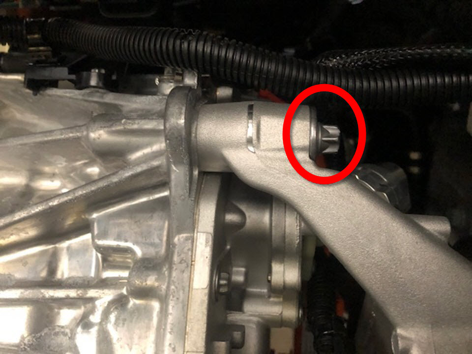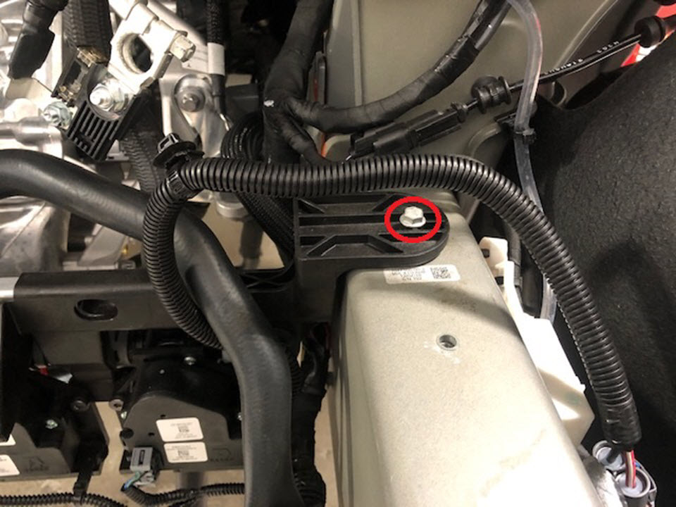 - Remove the bolt that attaches the front drive unit HV harness to the front drive unit (torque 10 Nm).