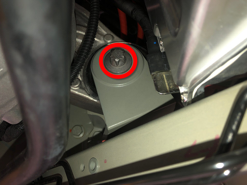 - Remove the rear lower bolt that attaches the RH side of the front drive unit mount to the body (torque 120 Nm).