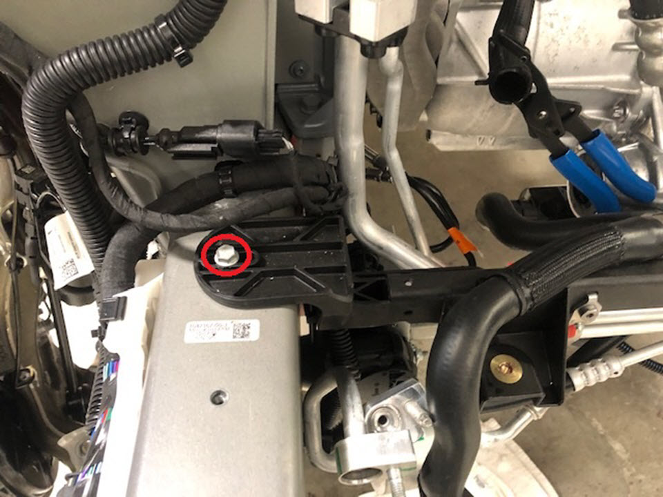 - Remove the edge clip that attaches the front drive unit electrical harness to the connector bracket.