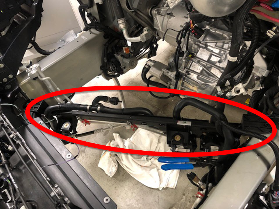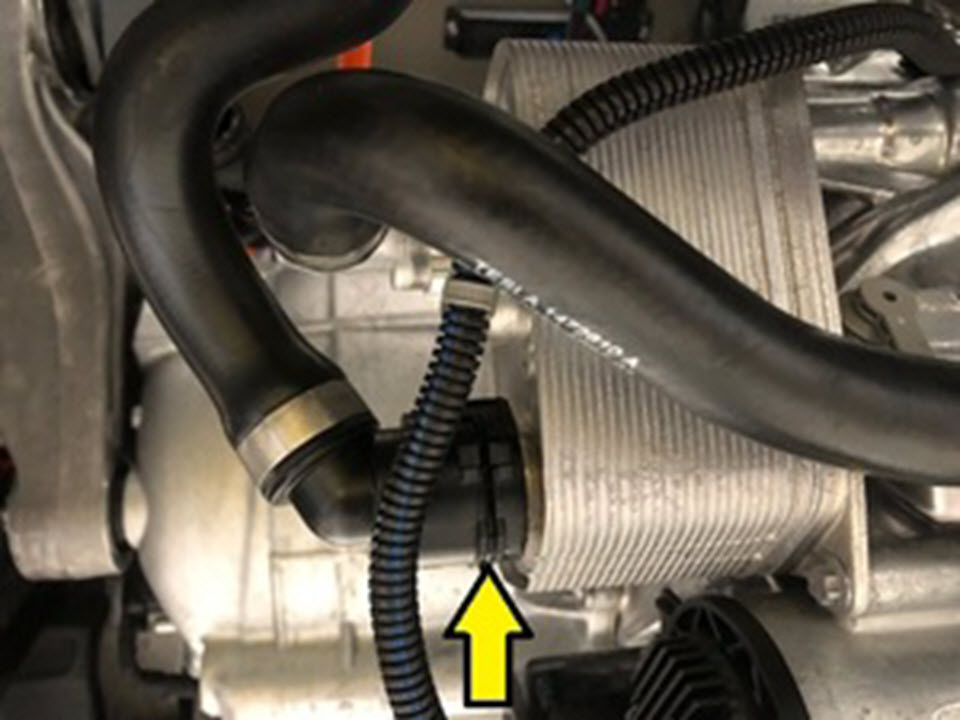 - Remove the spring clip, and then disconnect the lower coolant hose from the front drive unit heat exchanger. Plug both the heat exchanger and the hose using plugs from the coolant hose plug kit.