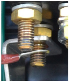- Use a paint or ink pen to mark the torque position after reassembly, using a different color than manufacturing (manufacturing usually uses yellow). Use one continuous motion to mark the bolt, washer, nut, and bus bar.