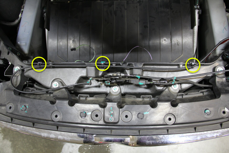 Release the edge clips (x3) that secure the primary cable to the front end module, and then remove the cable from the vehicle.