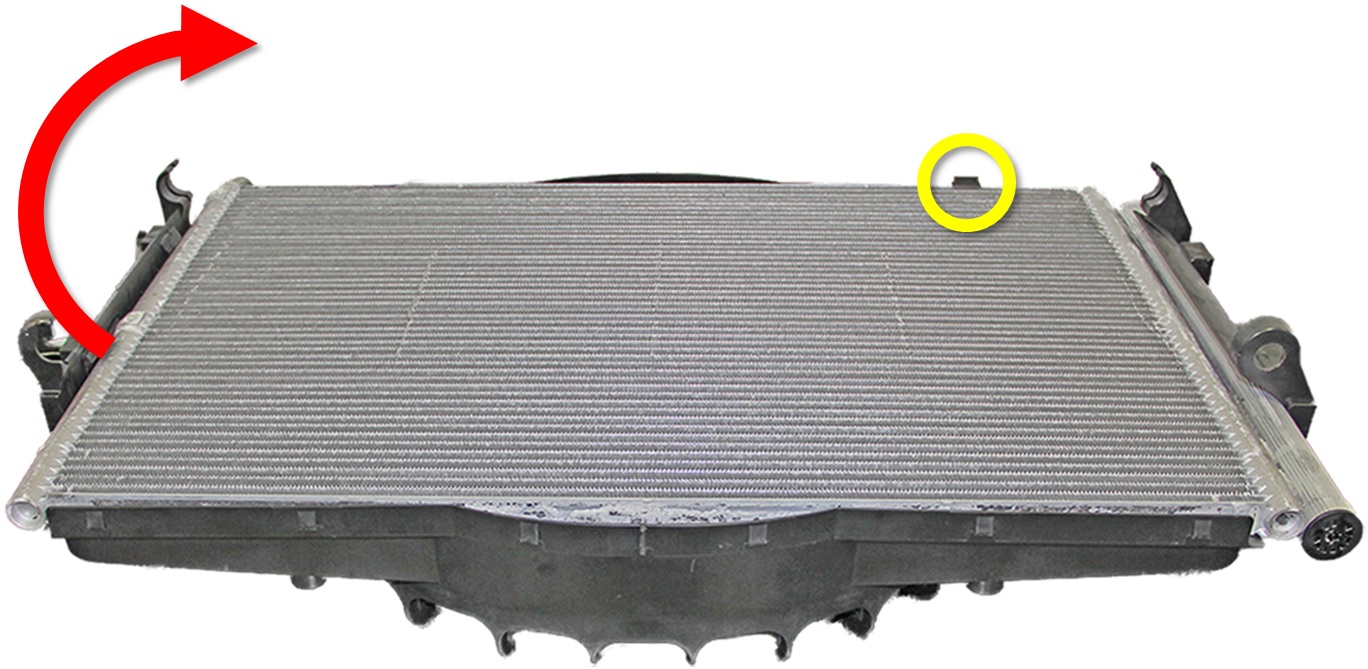 - Release the tab that secures the RH side of the condenser to the condenser fan.