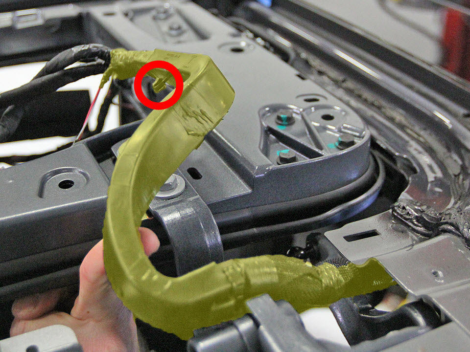 - Release the fir tree clip that secures the door harness to the upper door. Move the harness away from the primary hinge.
