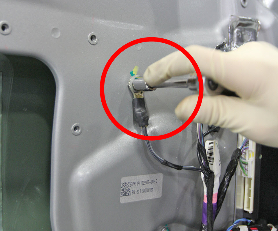 - Remove the nut that secures the ground strap to the door (torque 9 Nm).