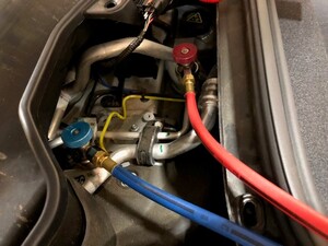 - Install dust caps (x2) onto the vehicle high and low side service ports.