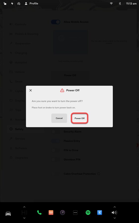 NoteVia center display > Controls > Safety > Power Off