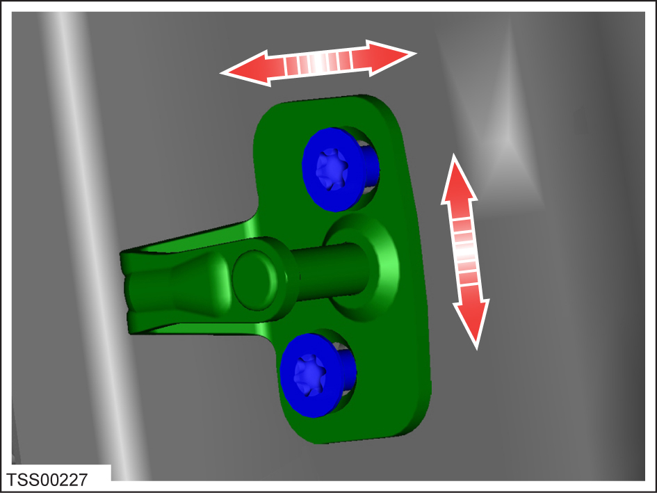 Remove Open the front door. Remove the countersunk screws (x2) that secure the striker plate to the B-pillar (torque 22 Nm). Informational PurposesAn informational icon, calling your attentionNoteNote the installed position of the components before removal. Remove the door striker from the vehicle.