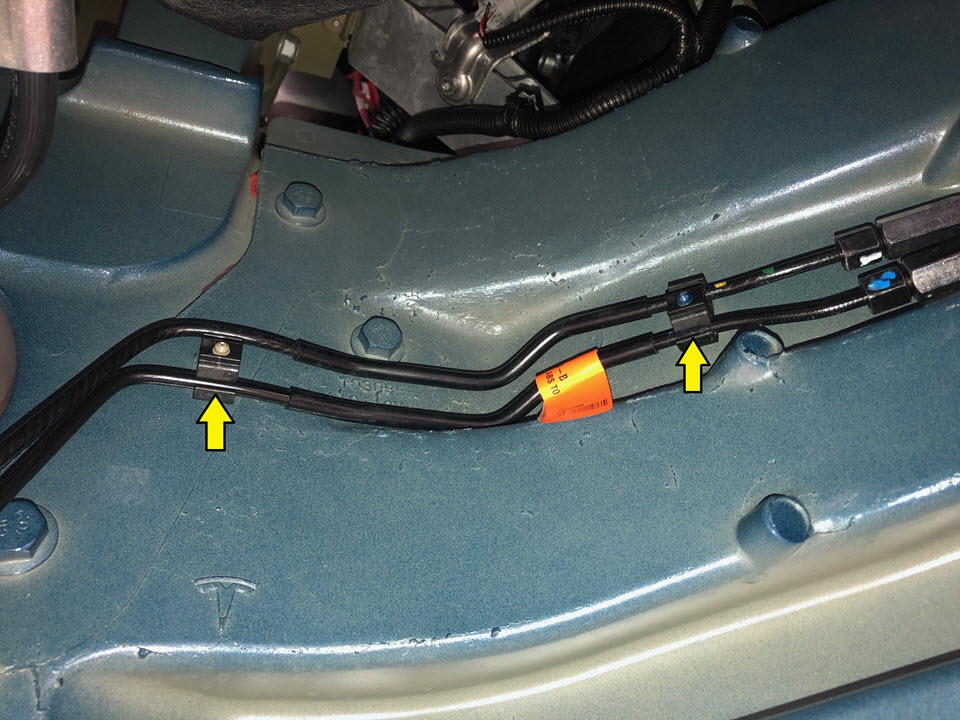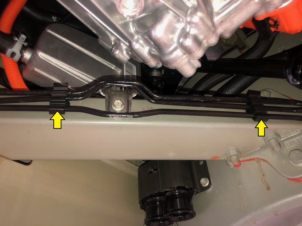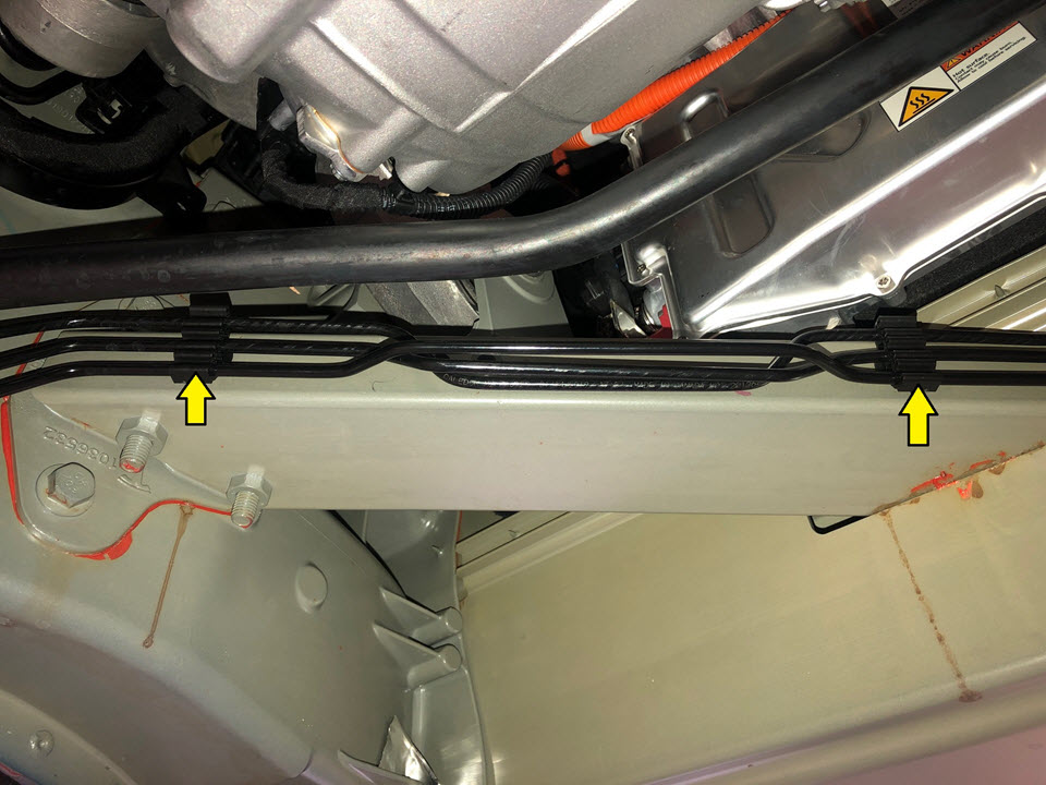 - Remove the clips (x2) that attach the brake line bundle to the LH side of the front torque box cross brace. Repeat this step on the RH side of the front torque box cross brace.