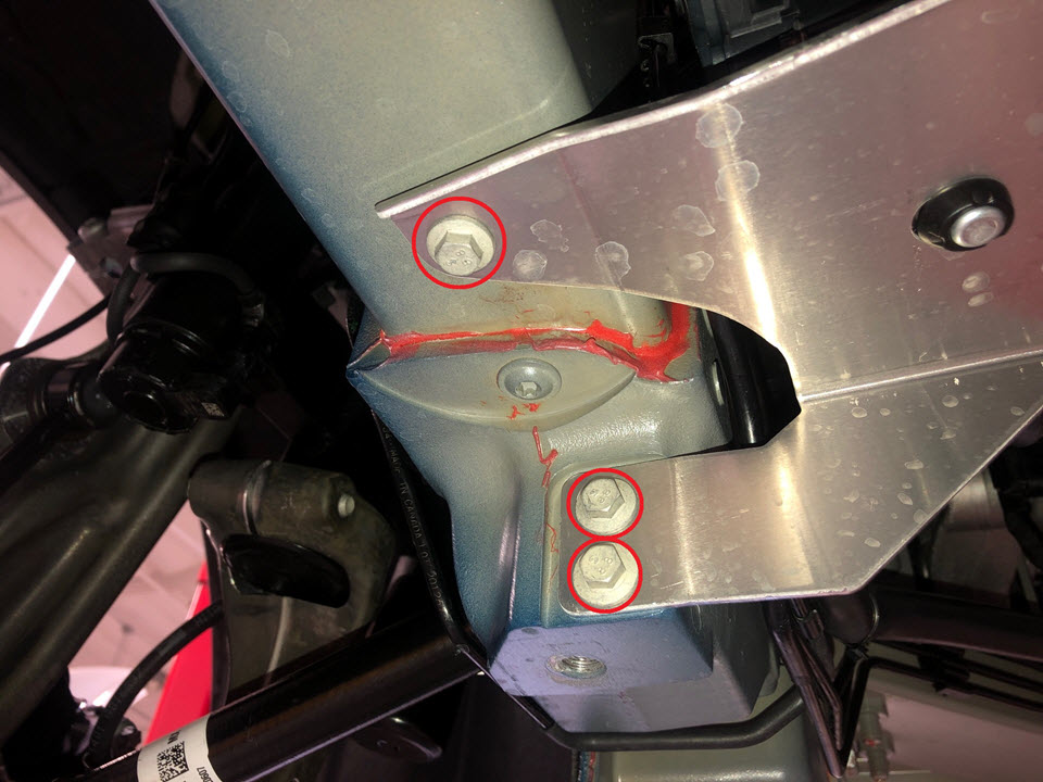 - Remove the bolts (x3) that attach the RH front adapter rail to the ABS modulator (torque 10 Nm).