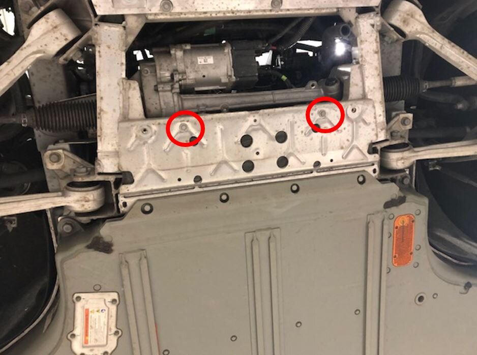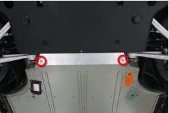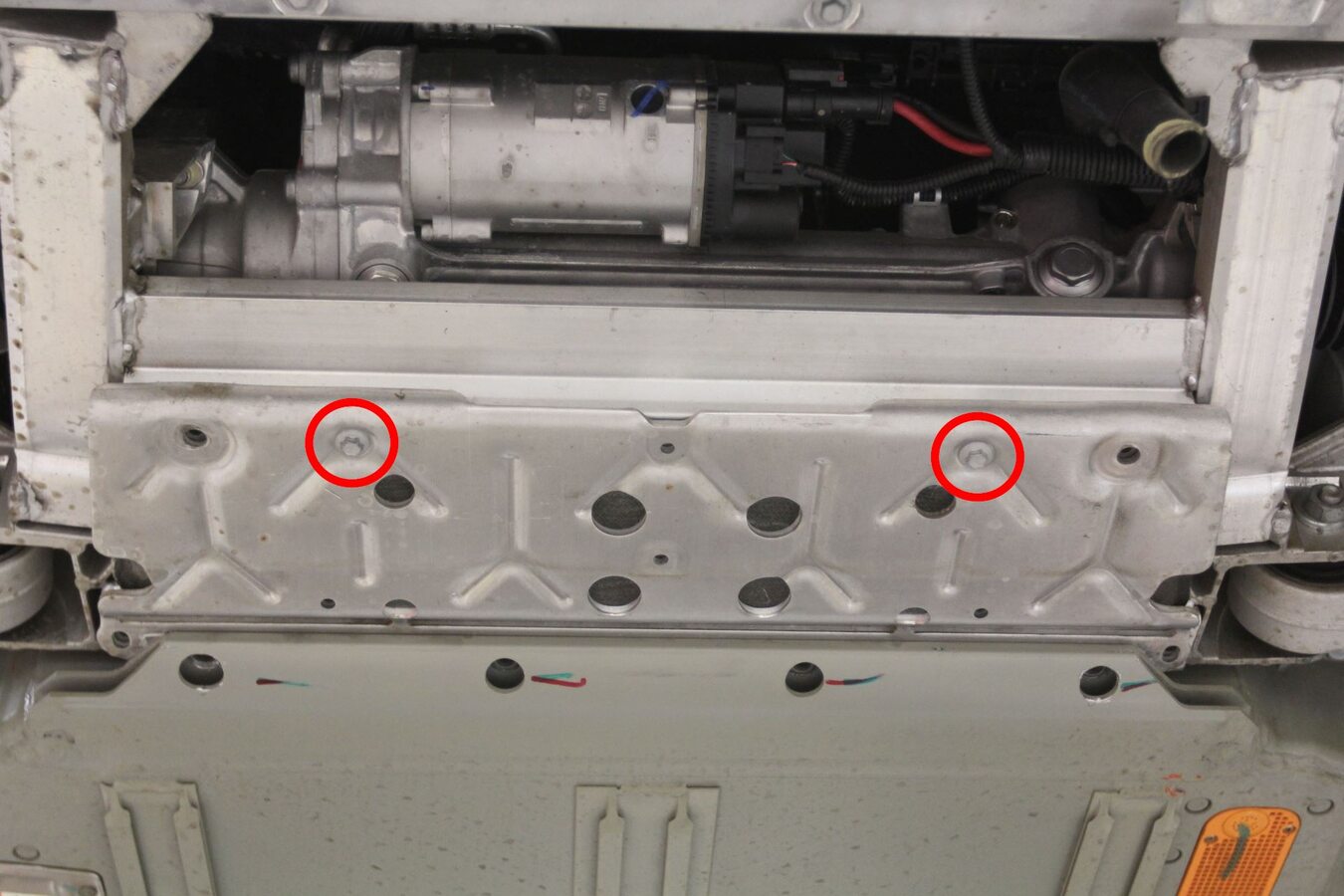 - Install the bolts (x2) that attach the front bash plate extrusion (torque 16 Nm).