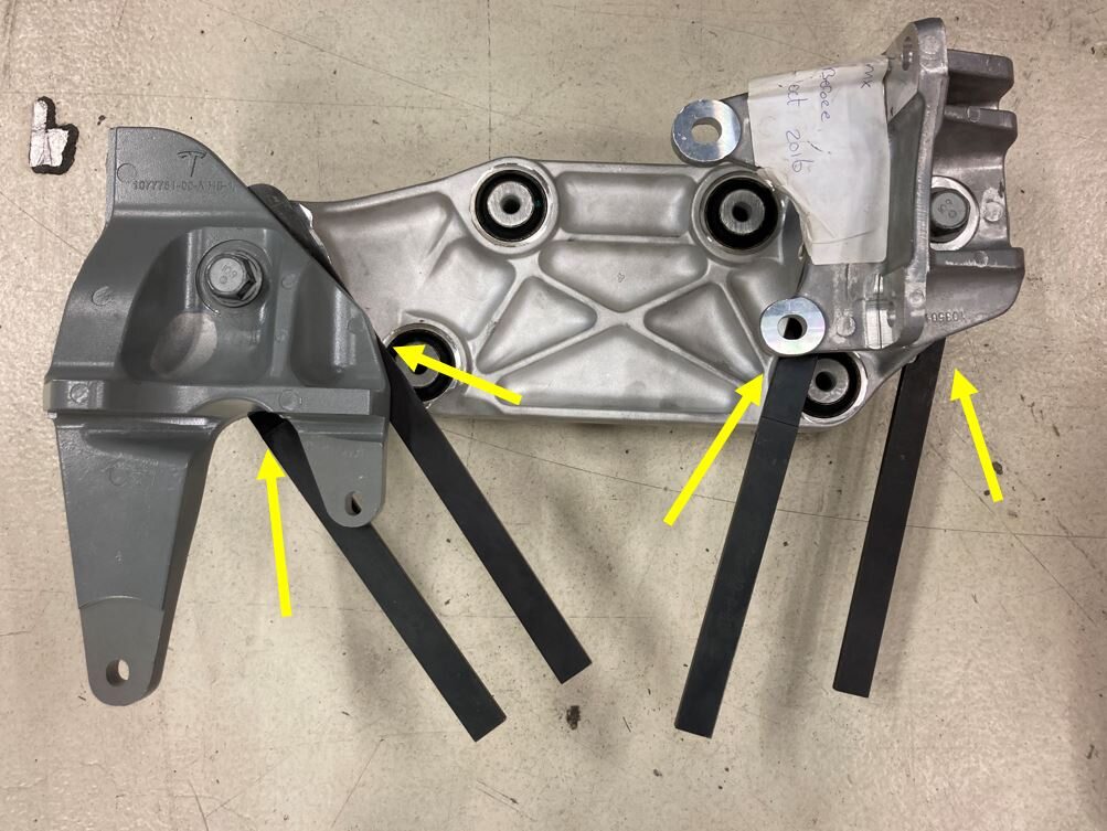 - Check that the drive unit mount locating shims are able to easily slide in and out of the mounts. If necessary, loosen and re-torque the clevis bolts until the shims easily slide in and out of the mounts.