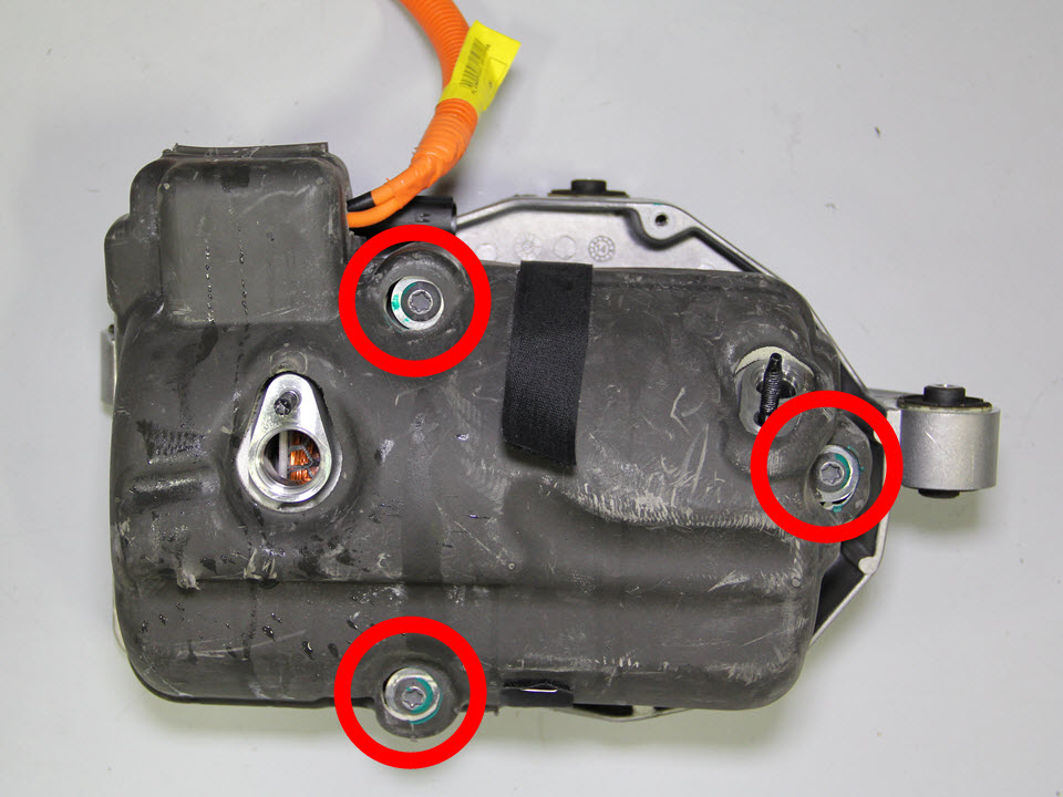 - Have an assistant support the compressor. Remove the bolts (x3) that attach the A/C compressor bracket to the front drive unit (torque 10 Nm).