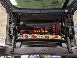 NoteAdjust the lower falcon door hinges, the upper corner of the lower falcon door should be adjust a bit under flush at this time, the struts should push it out once installed. Recommend assistance, 6x bolts, E18, 32Nm, 4x bolts, 13mm, 24 Nm