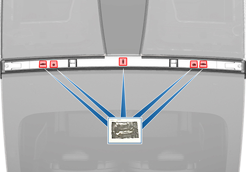 NoteComponents have been removed in this graphic to aid clarity.NoteThe rear roof applique is secured to the body by sealant, metal clips (x3), and plastic clips (x2).