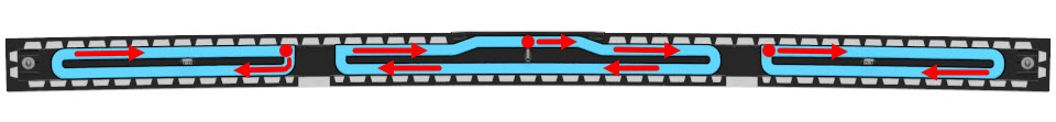 - Apply sealant on the new rear roof applique. Use the path directed in the following image, starting at the dots and following the arrows.