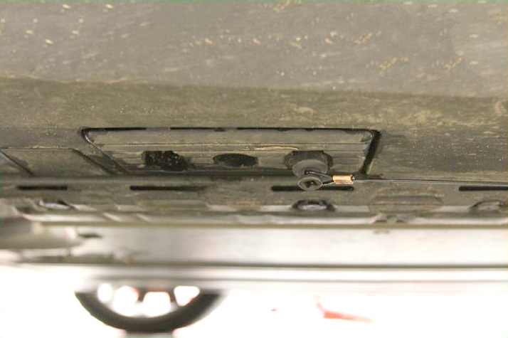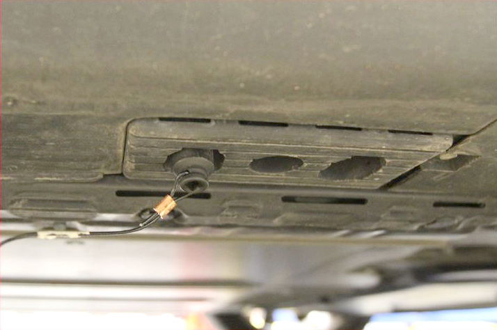 - Attach the cap of the target tool long cable over the rear bolt of the front lifting pad under the vehicle.