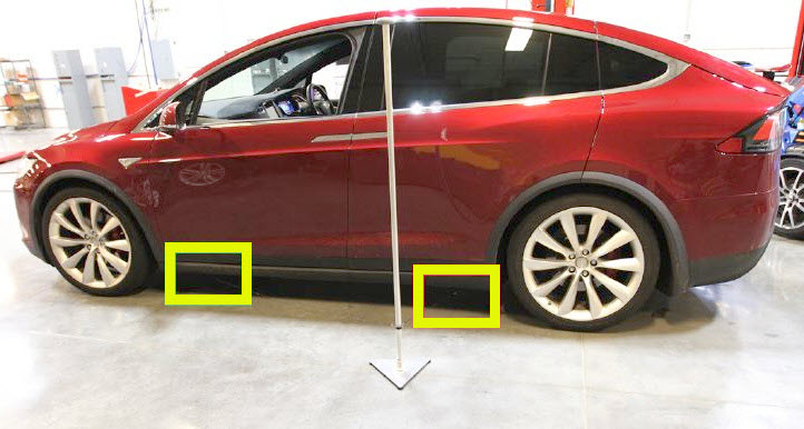 - Attach the cap of the target tool short cable over the front bolt of the rear lifting pad under the vehicle.