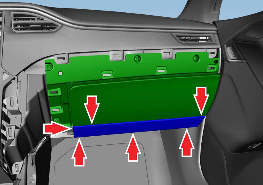 - Remove the screws (x6) that secure the glove box to the instrument panel (torque 2.3 Nm).