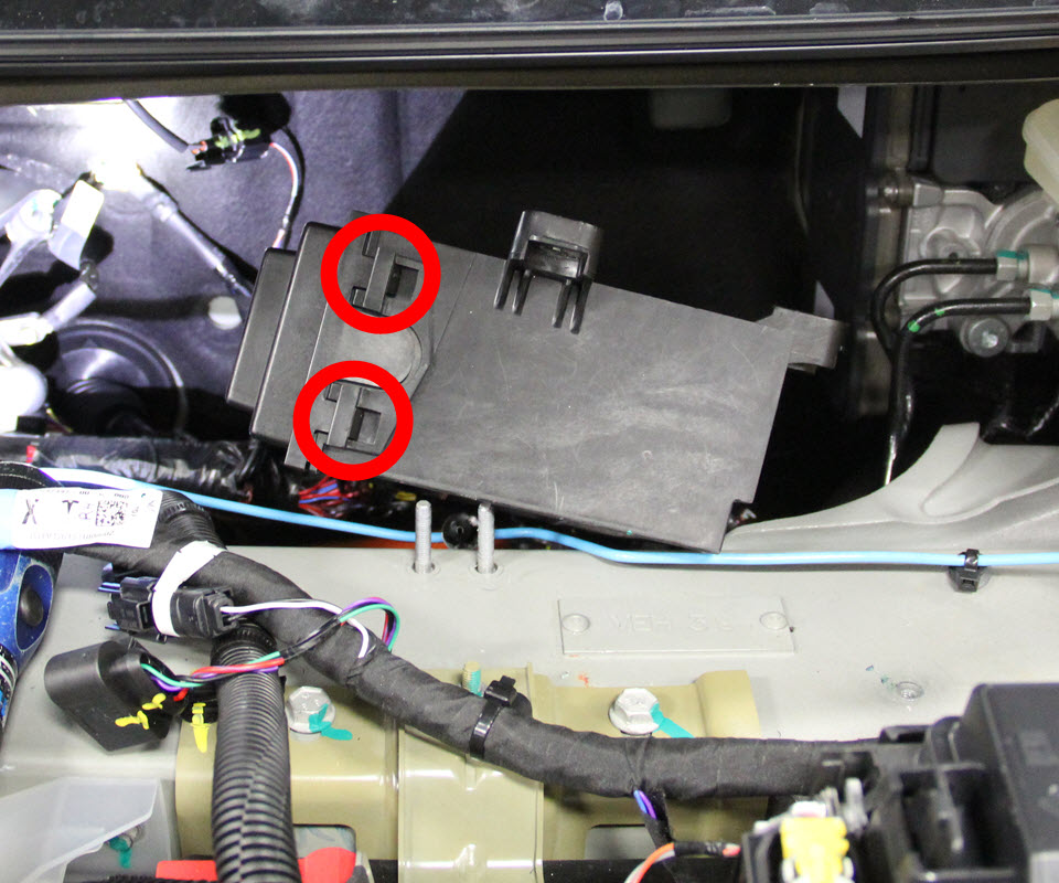 - Release the 2 clips that secure the fuse box harness.