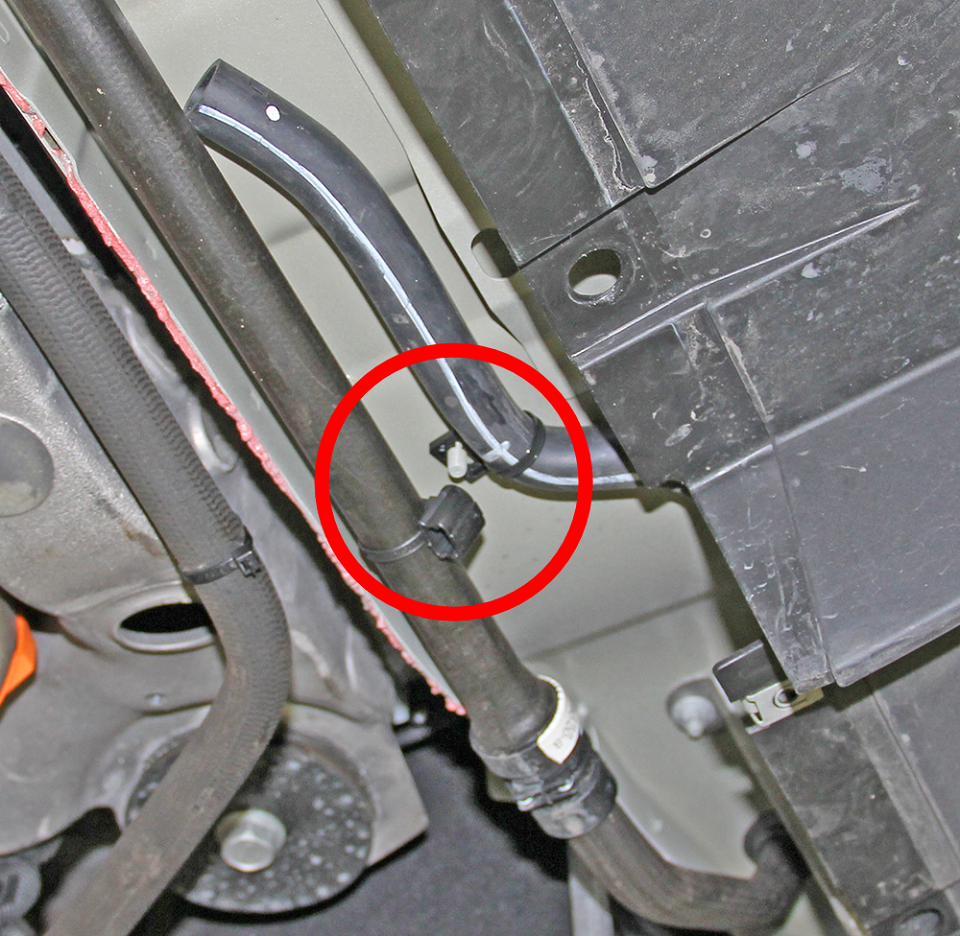 - The drain hose is not routed through the rear aero shield trunk bracket.