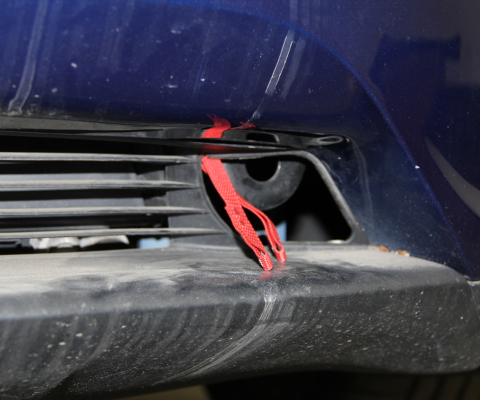 - Release the straps from the tow hook cover and move them through the tow hook opening.