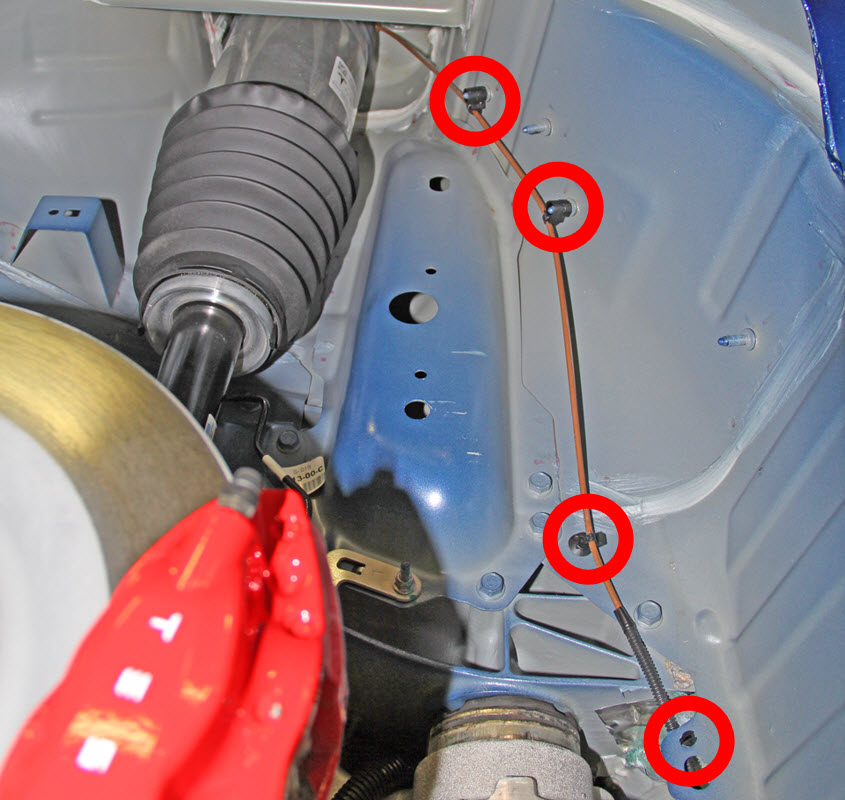 - Release the clips (x8) that attach the air spring module lines (green and brown) to the RH front wheel arch.
