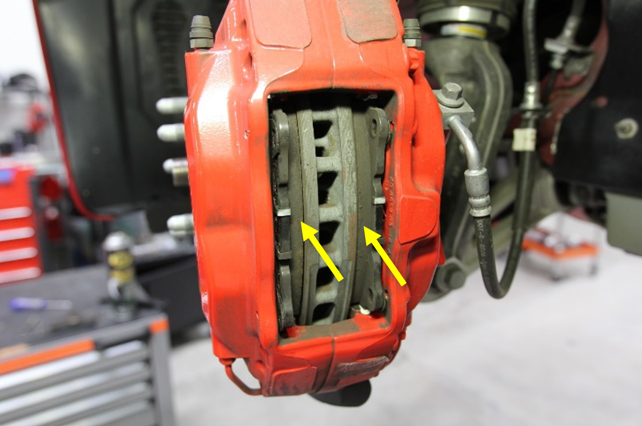 the inner surfaces of the front LH caliper, the retaining pins, the