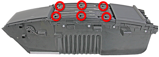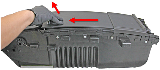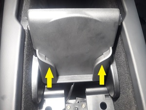 - Remove the sliding lid from the center console sub-assembly by sliding it towards the rear of the sub-assembly and lifting up once the clips are released from the holes in the sub-assembly.