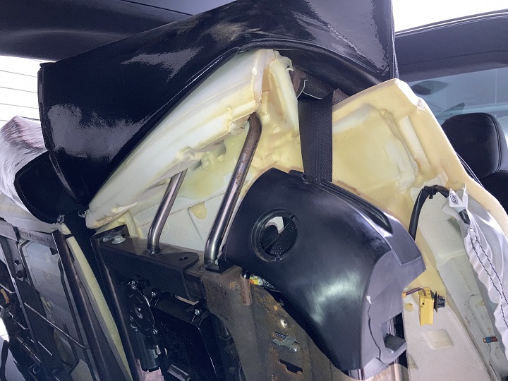 - Lift up the top part of the seat back trim, feed the seat belt through the seat cushion pass through, and then remove the back trim from the seat frame.