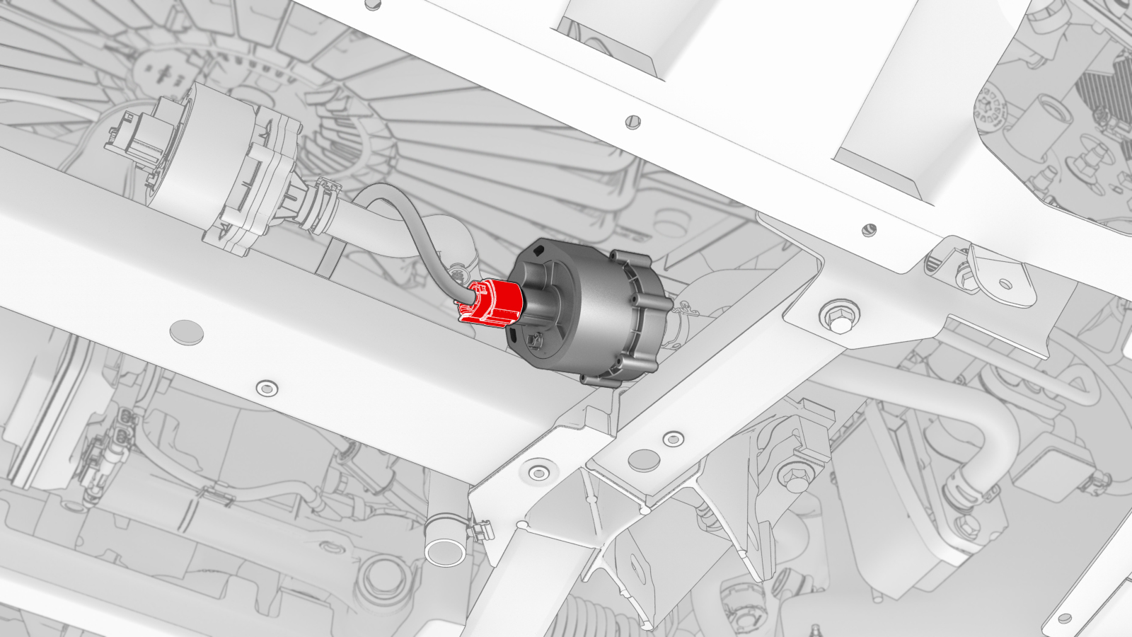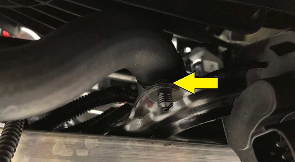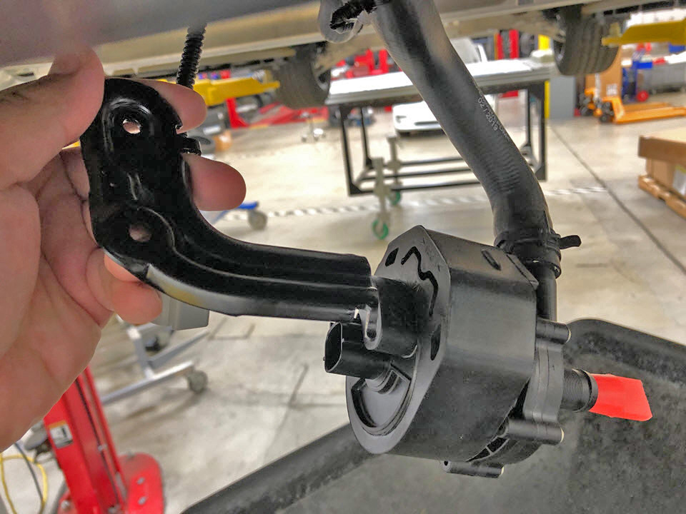 - Remove the bolt that attaches the battery coolant pump 1 bracket to the front subframe (torque 12 Nm). Allow the pump to hang at this time.