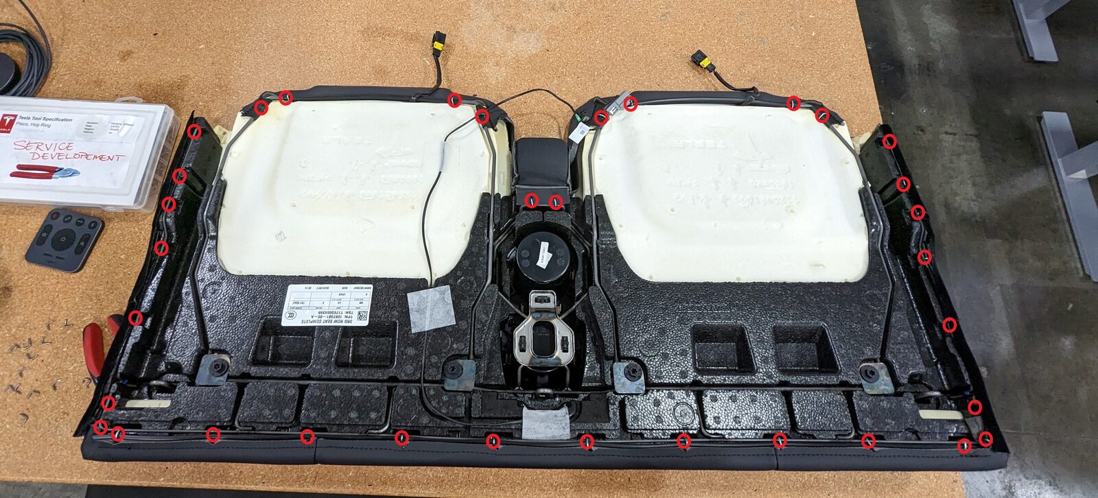 Cut and remove the hog rings (x34) that attach the bench seat trim to the seat assembly for sensor access.