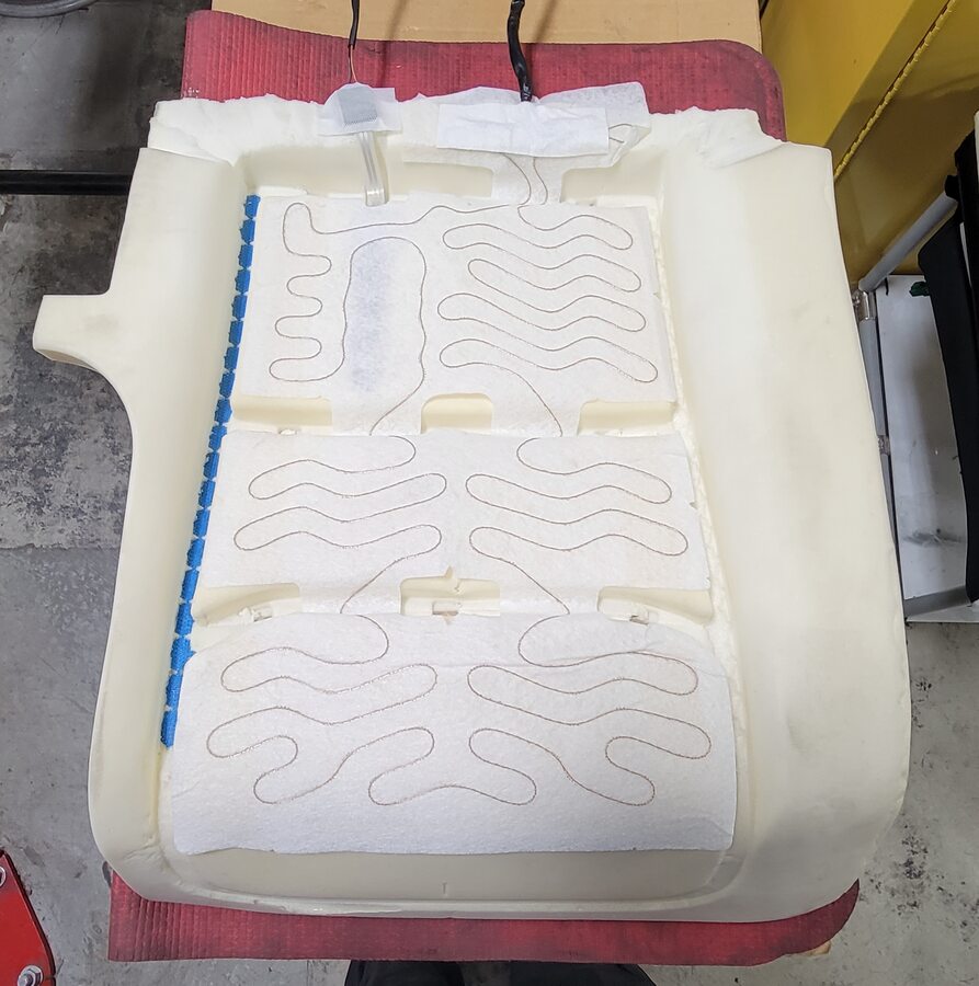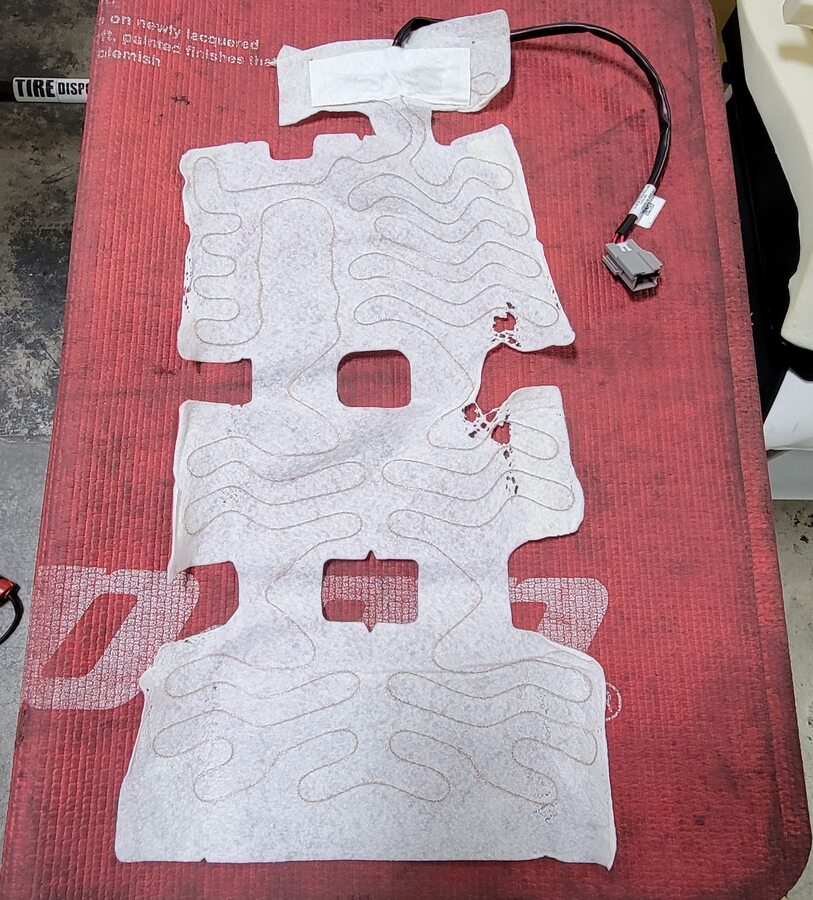 Use a heat gun to heat the adhesive in the highlighted areas, and then remove the 3rd row seat cushion heat pad from the cushion foam.