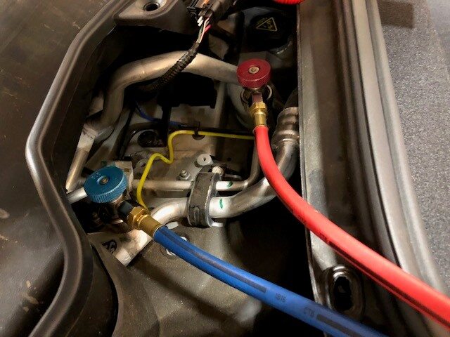 Note(Touch time only)30 minute vacuum, 10 minute leak test. Ensure quick connects are fully engaged, turn the connector dials clockwise to fully connect to A/C service ports