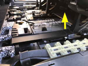 NoteLift front of panel up to release clips, While lifting up, need to release the rear sliding plates from the seat and slide them all the way back, Once free, lift rear of panel and slide out from behind seats, Use caution since floor panel can damage HVAC ducts
