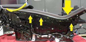 - 安装用于将中控台饰板固定到中控台总成上的卡子(2 个),连接中控台连接器(6 个),然后用毛毡胶带缠好连接器(2 个)。