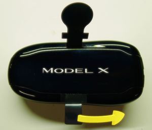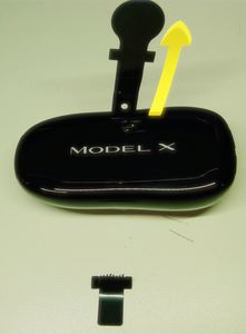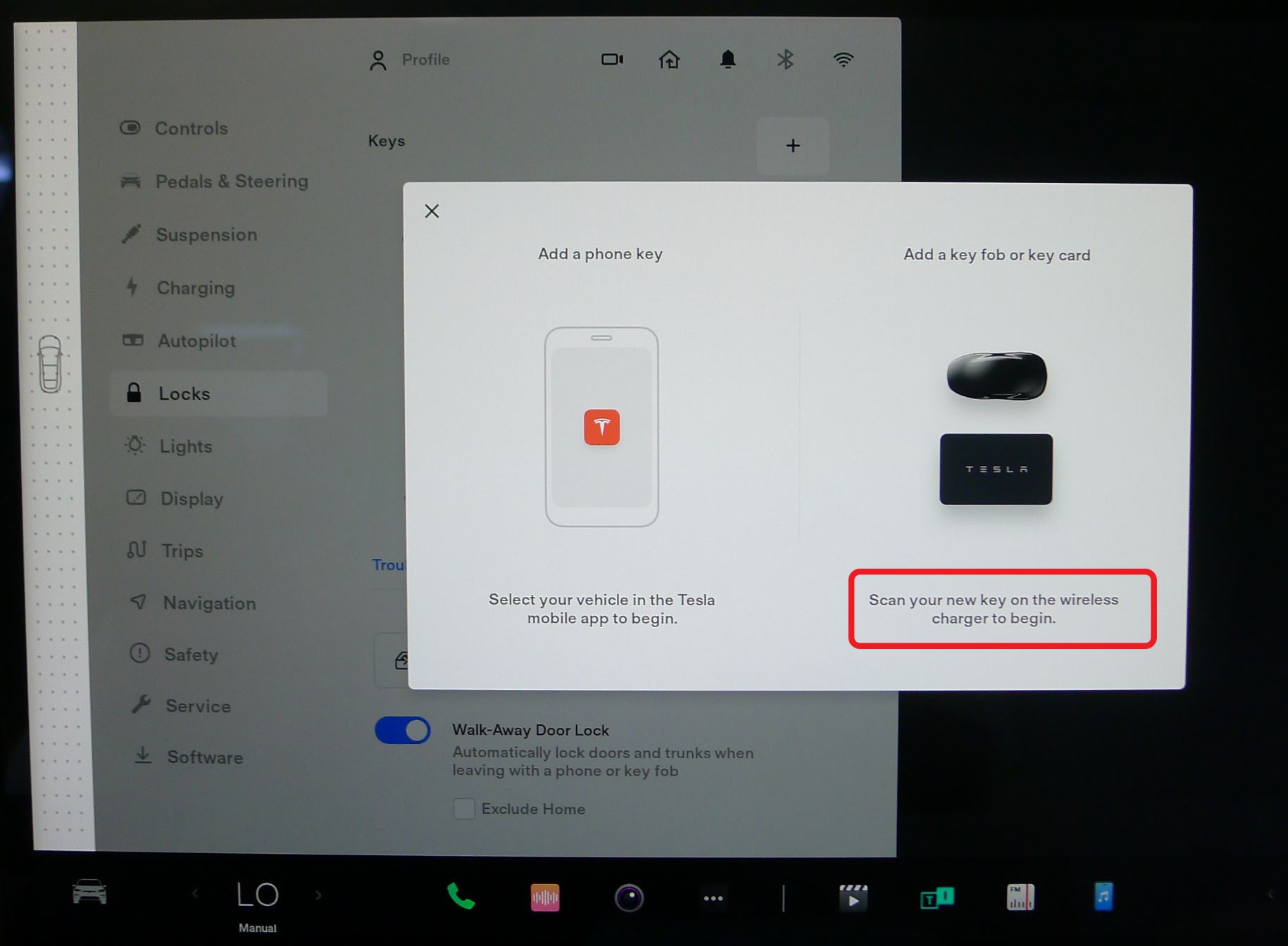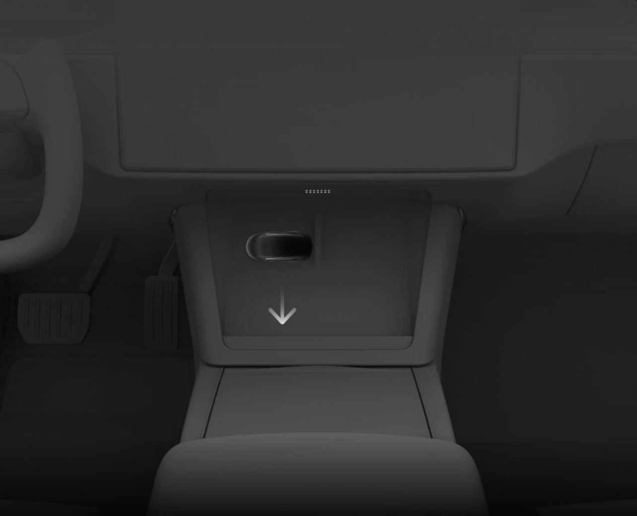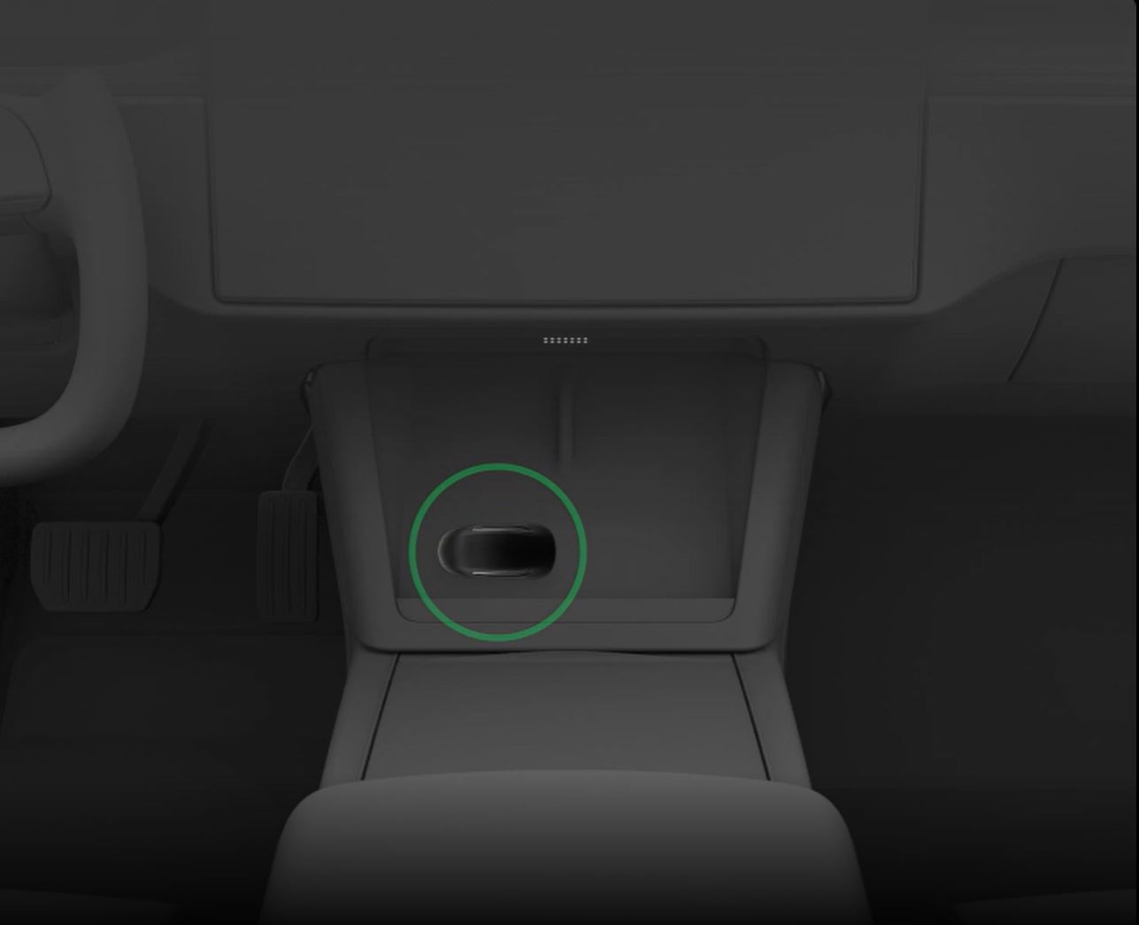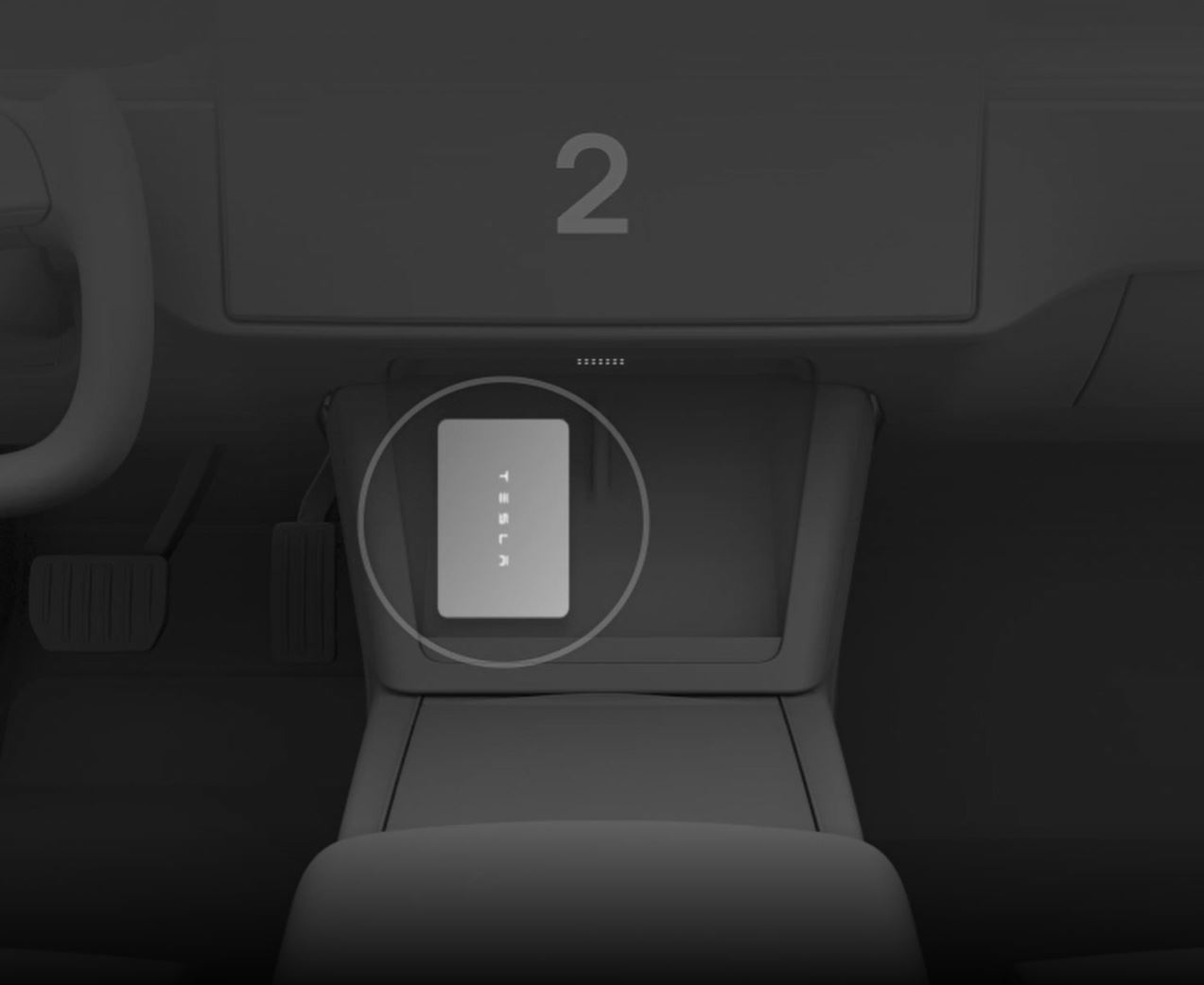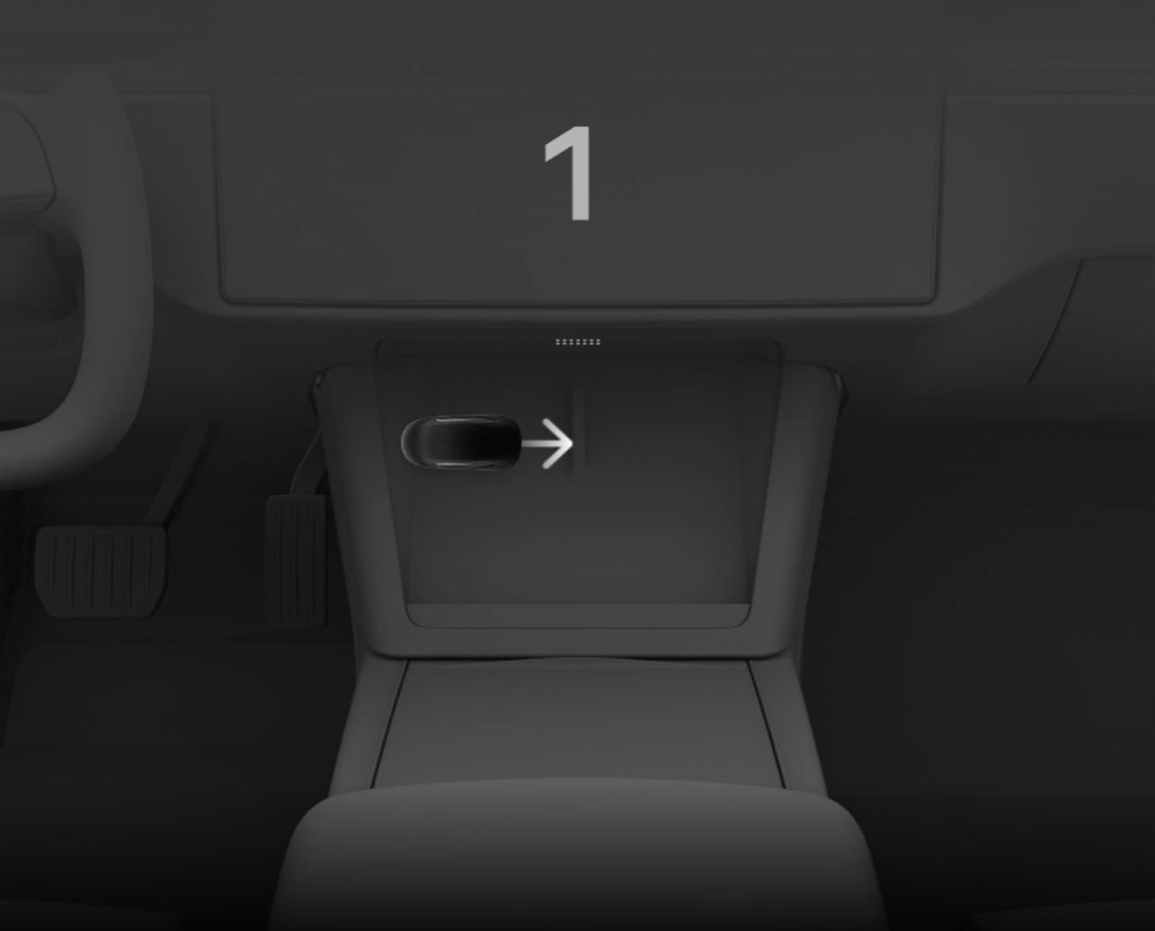 注将遥控钥匙上的 Tesla 徽标朝向左侧,沿无线充电器中线以低中速度移动遥控钥匙。识别到新的遥控钥匙后,扫描请求菜单将消失。识别完成后,将遥控钥匙从无线充电器上取下。