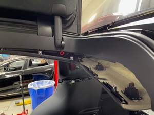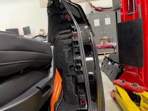 将左侧 C 柱后部门框硬盖板饰板安装到车辆上,然后安装用于将饰板固定到车辆上的螺钉并紧固卡子(20 个)。