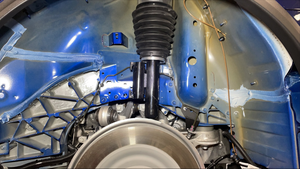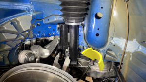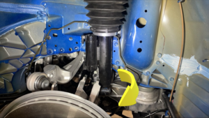注建议请助手帮忙,请小心操作,防止损坏任何部件。首先放入支柱上部分,将螺柱与车身孔对齐,然后将下衬套旋入万向节中,使用尖冲头帮助对齐转向节。