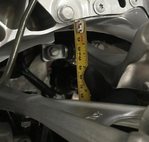 测量从上前连杆到车架纵梁上螺栓的距离,确保左侧悬架设置为行驶高度。