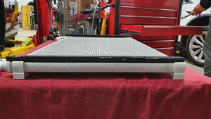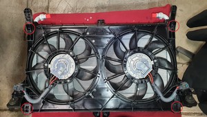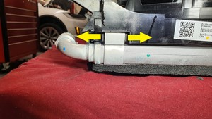 将散热器进出水软管放在散热器的顶部左侧,然后安装将软管连接到散热器的弹簧夹(2 个)。